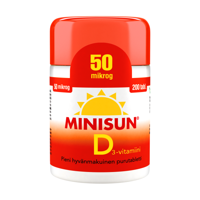 Minisun D-vitamintabletterna som utvecklats i Finland är ett enkelt sätt att trygga behovet av vitamin D året om. Minisun 50 mikrog innehåller vitamin D3 som effektivt tas upp i kroppen. Vitamin D förstärker motståndskraften och är ett viktigt vitamin för välmående benstomme, muskler och tänder. Doseringen är enkel - en liten tuggtablett per dag räcker till. Minisun 50 mikrogram är välsmakande och lämpar sig för unga, vuxna och äldre för ett effektiverat dagligt intag året om. Tabletterna är sötade med xylitol, och de kan tas både som sug- och tuggtabletter, sväljas hela eller krossas. Produkten innehåller varken laktos, gluten, jäst, soja eller gelatin. Dosering: Sötningsmedel (sorbitol, xylitol), D3-vitaminpreparat, ytbehandlingsmedel (magnesiumsalter av fettsyror). Innehåller sötningsmedel. Överdriven konsumtion kan ha laxerande verkan. Laktos-, gelatin- och sojafri. Innehåll: En tablett innehåller: D3-vitamin (kolekalciferol) 50 mikrog (2000 IU), 1000 % av referensvärdet. Förte